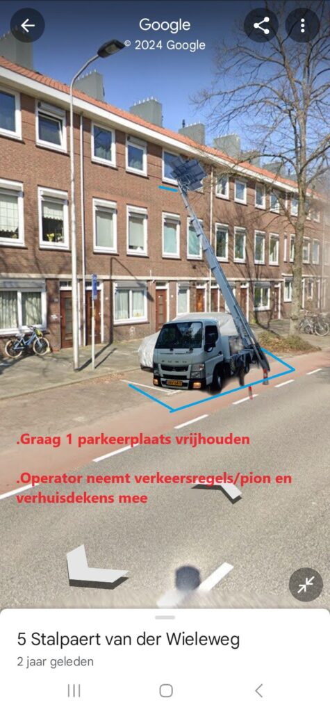 Na de afspraak streven we ernaar het onze klanten zo makkelijk mogelijk te maken. We bekijken de verstrekte adresgegevens en bepalen samen met onze operators welke huishoudelijke artikelen of bouwmaterialen voor de verhuislift nodig zijn. Nadat we de juiste venster of balkon hebben bepaald, identificeren we op Google Street View de locatie voor het opbouwen van de verhuislift en geven we onze klanten feedback. We tonen hoe de verhuislift voor hun huis moet worden opgebouwd door middel van een fotomontage op Google Street View, zoals hieronder als voorbeeld weergegeven bij Delft .