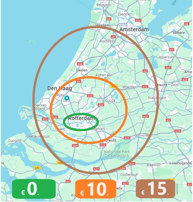 Let op: De vermelde voorrijkosten zijn een schatting en kunnen variëren op basis van de specifieke locatie binnen elke stad. Voor een nauwkeurige berekening raden wij u aan de bijgevoegde kaart te raadplegen.